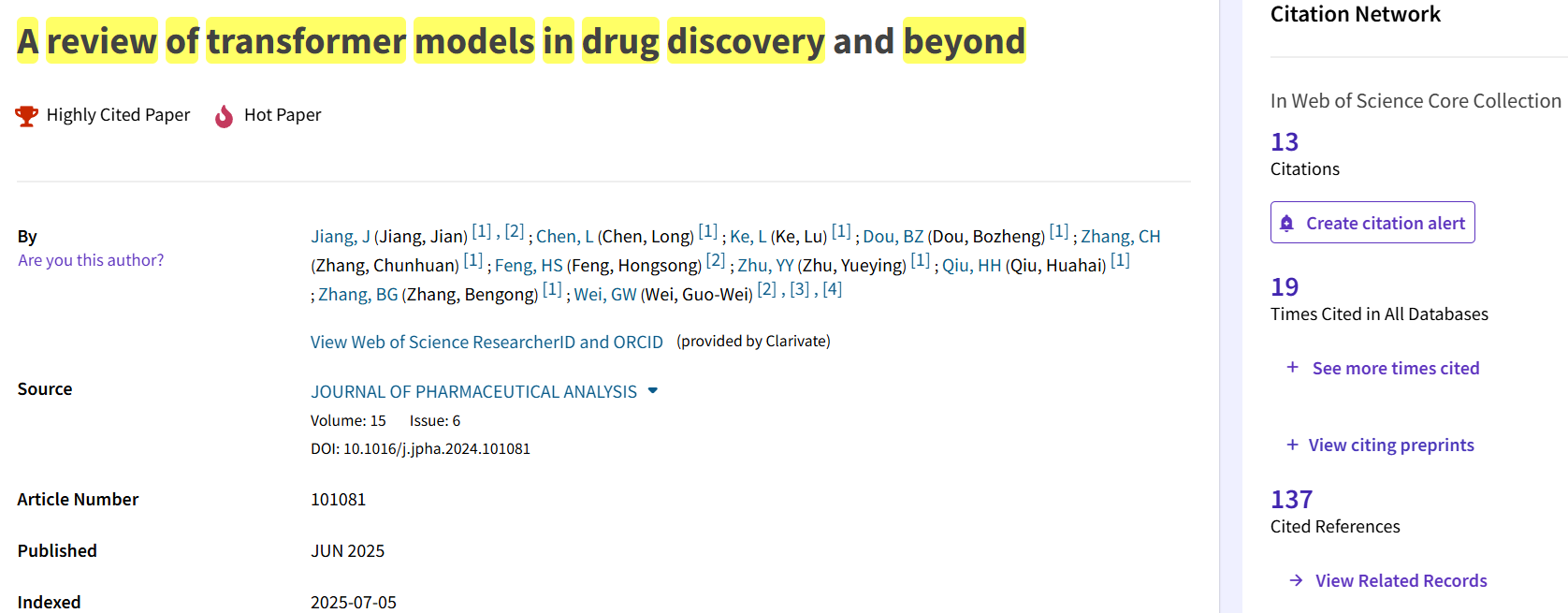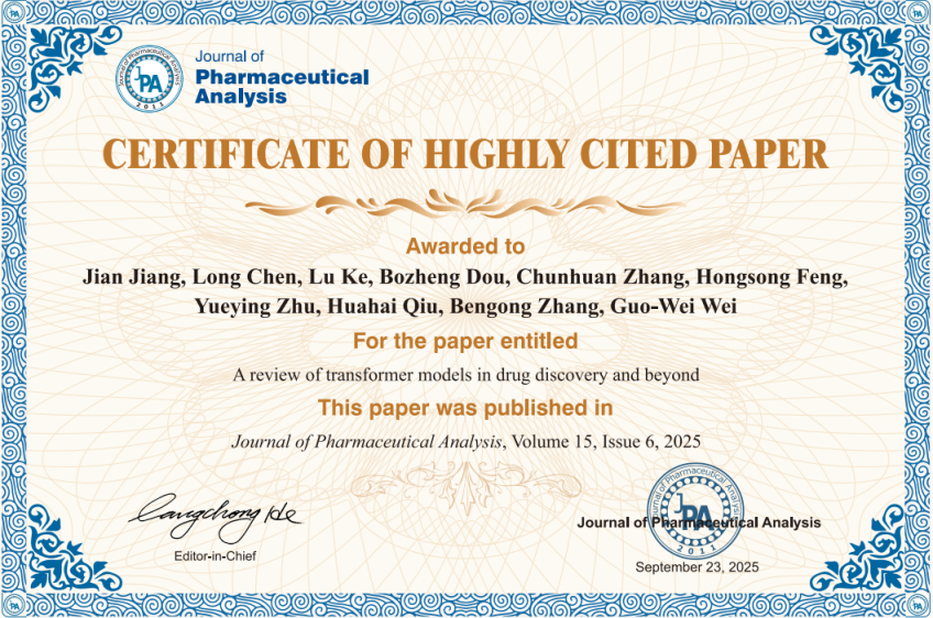 根据Essential Science Indicators(简称ESI)最新数据显示,我校数统学院江健教授团队2025年6月发表在国际学术顶级期刊《Journal of Pharmaceutical Analysis》(中科院一区Top)的学术论文“A review of transformer models in drug discovery and beyond”(J. Pharm. Anal. 15, 6, 101081, 2025,)成功入选药理学与毒理学领域ESI全球前0.1%热点论文。论文第一作者为江健教授,美国密歇根州立大学Guo-Wei Wei教授为通讯作者,武汉纺织大学为第一通讯单位。