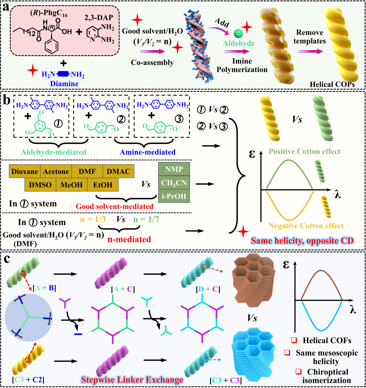 研究中,王栋教授团队采用超分子转录策略,在手性软模板引导下合成了一系列螺旋状亚胺共价有机聚合物。研究结果表明,在保持螺旋方向完全一致的前提下,仅通过微小的反应条件调控,即可实现材料圆二色性信号由正到负的翻转,甚至实现连续可调。进一步研究表明,这种手性光学异构化并非源于宏观螺旋结构的改变,而是来自亚纳米尺度构筑单元在螺旋骨架内部的不同手性堆积方式,即在整体螺旋方向不变的情况下发生了内部精细结构的“手性重排”。更为重要的是,研究团队进一步利用动态共价化学与单体交换策略,将上述螺旋聚合物成功转化为高度有序的晶态共价有机框架材料。在经历多次共价键断裂与重组的过程中,材料不仅保持了原有的介观螺旋手性,其手性光学异构化特征也被完整继承,即使在同时更换胺类和醛类构筑单元、形成全新骨架结构的情况下,该独特手性行为仍稳定存在。该研究首次在共价有机框架体系中明确证明:手性光学响应并不完全由宏观螺旋结构决定,而对更精细的分子尺度堆积高度敏感,为理解多尺度手性传递机制提供了新的理论框架。
