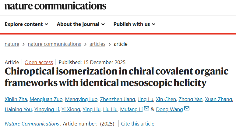 12月15日,纺织纤维及制品教育部重点实验室王栋教授团队在Nature子刊《Nature Communications》发表题为“Chiroptical Isomerization in Chiral Covalent Organic Frameworks with Identical Mesoscopic Helicity”的高水平研究论文。该论文由平台青年教师查新林博士和硕士研究生左梦娟担任共同第一作者,王栋教授与李沐芳教授为共同通讯作者,硕士研究生蒋珍珍亦为论文完成作出了重要贡献,武汉纺织大学为唯一署名单位。