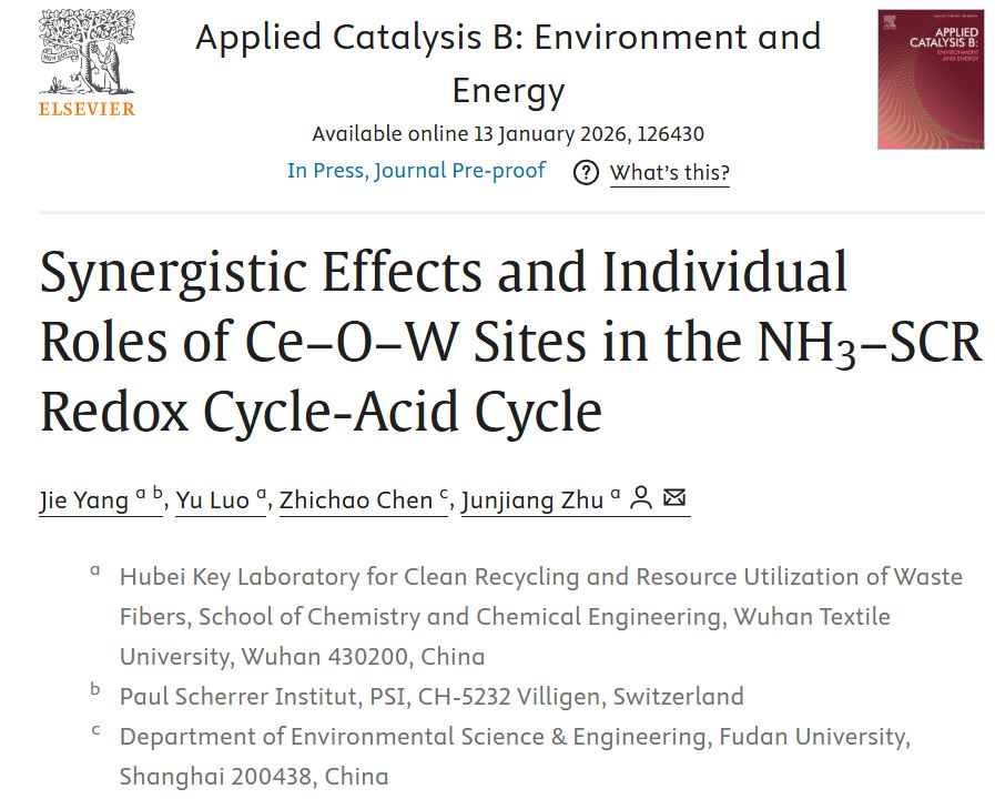 近日,我校化工学院朱君江教授团队在国际知名期刊Applied Catalysis B: Environment and Energy发表了题为“Synergistic effects and individual roles of Ce–O–W sites in the NH3–SCR redox cycle-acid cycle”的研究论文,武汉纺织大学为论文第一署名单位,团队青年教师阳杰博士为论文第一作者,朱君江教授为论文唯一通讯作者。