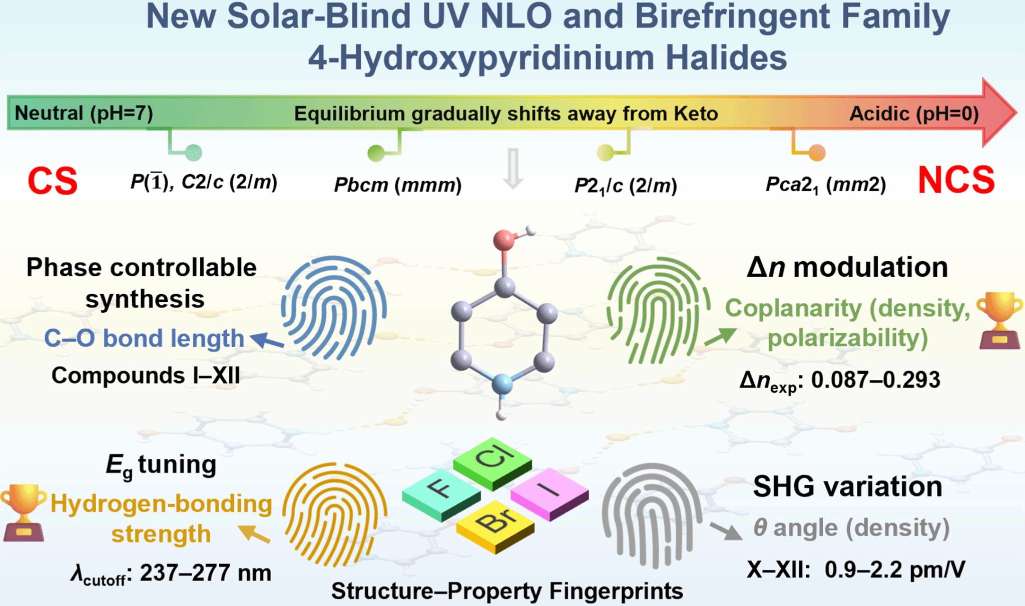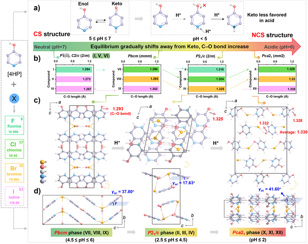 本研究中,武汉纺织大学的陈玲教授团队报道了十二种全新的4 -羟基吡啶鎓卤化物,其中[4HPH]⁺与[X]⁻功能基元具有较大的HOMO–LUMO带隙,使其可应用于日盲紫外区域。该系列晶体展现出多阴离子体系材料中最宽的带隙,且可通过氢键强度实现带隙调控。通过调控溶液 pH 值,该体系可实现可控结构相变:从中心对称相(空间群:P1(I)、C2/c (V,VI)、Pbcm (VII–IX)、P2₁/c (II–IV))转变为非中心对称相 Pca2₁(X–XII)。其中 C–O 键长可作为特征结构标识。在这些化合物中,[C5H6NO]+(HF2)−在 4HPX 家族以及已报道的无水 SUV 晶体中表现出最大的双折射率值(0.293);而具有无心结构的化合物(C5H6NO)+(Cl)−、(C5H6NO)+(Br)−、(C5H6NO)+(I)−分别展现了较强的二次谐波产生响应,分别为1.84、1.01 和 0.75 × KDP。这些化合物有望应用于日盲区双折射晶体材料和倍频晶体材料。