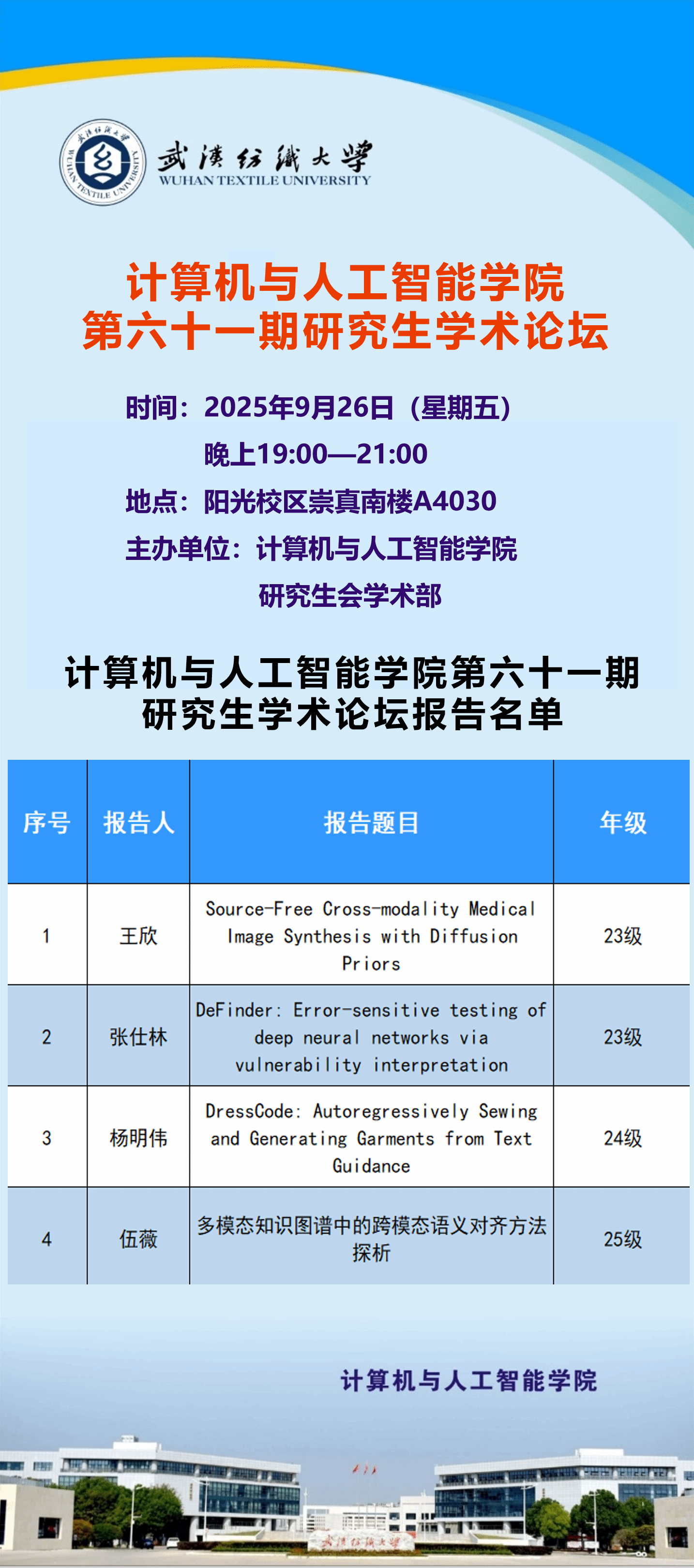 2025 10-09学术预告:第955期研究生学术论坛暨计算机与人工智能学院2025年第7期研…