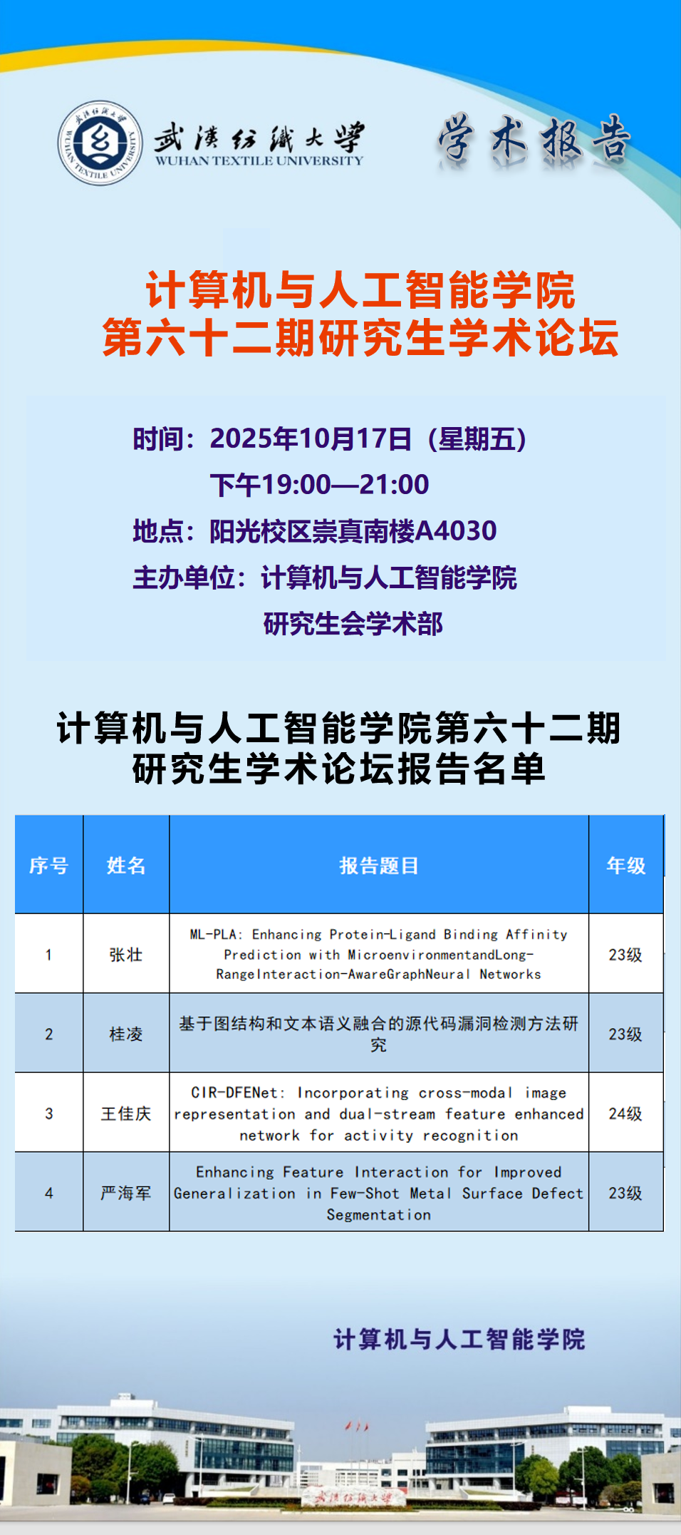 2025 10-09学术预告:第955期研究生学术论坛暨计算机与人工智能学院2025年第7期研…