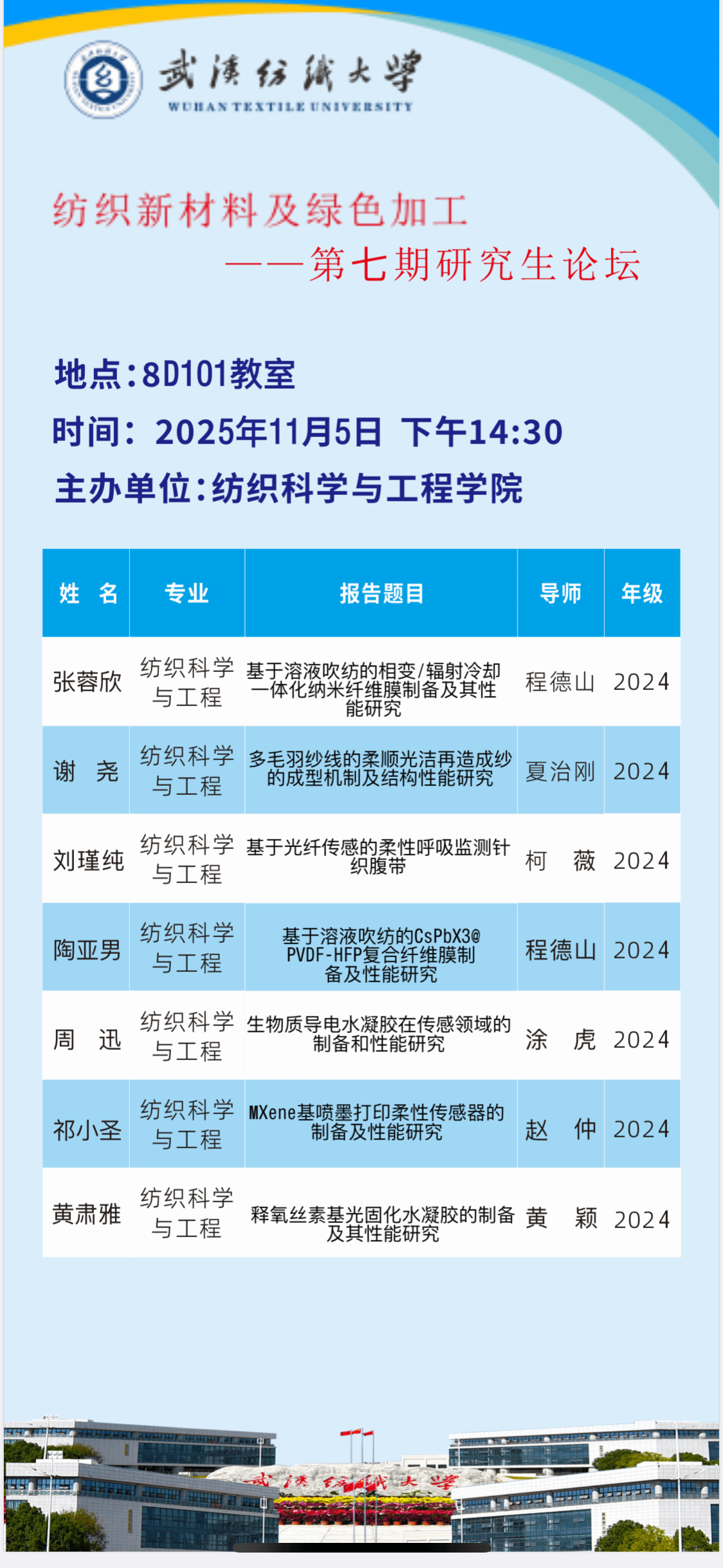2025 11-10学术预告:第991期研究生学术论坛暨纺织科学与工程学院2025年第8期研究…