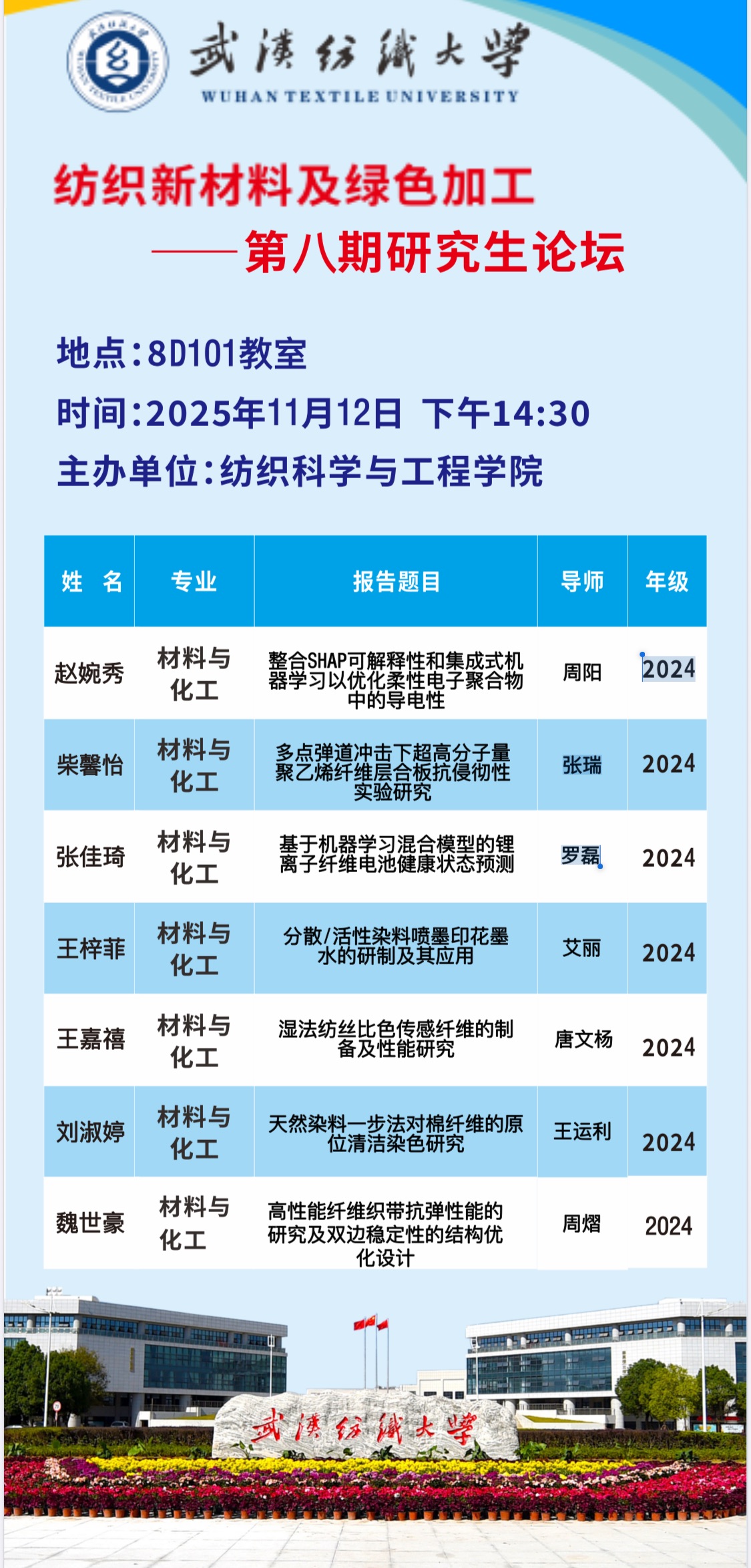 学术预告:第991期研究生学术论坛暨纺织科学与工程学院2025年第8期研究生学术论坛
