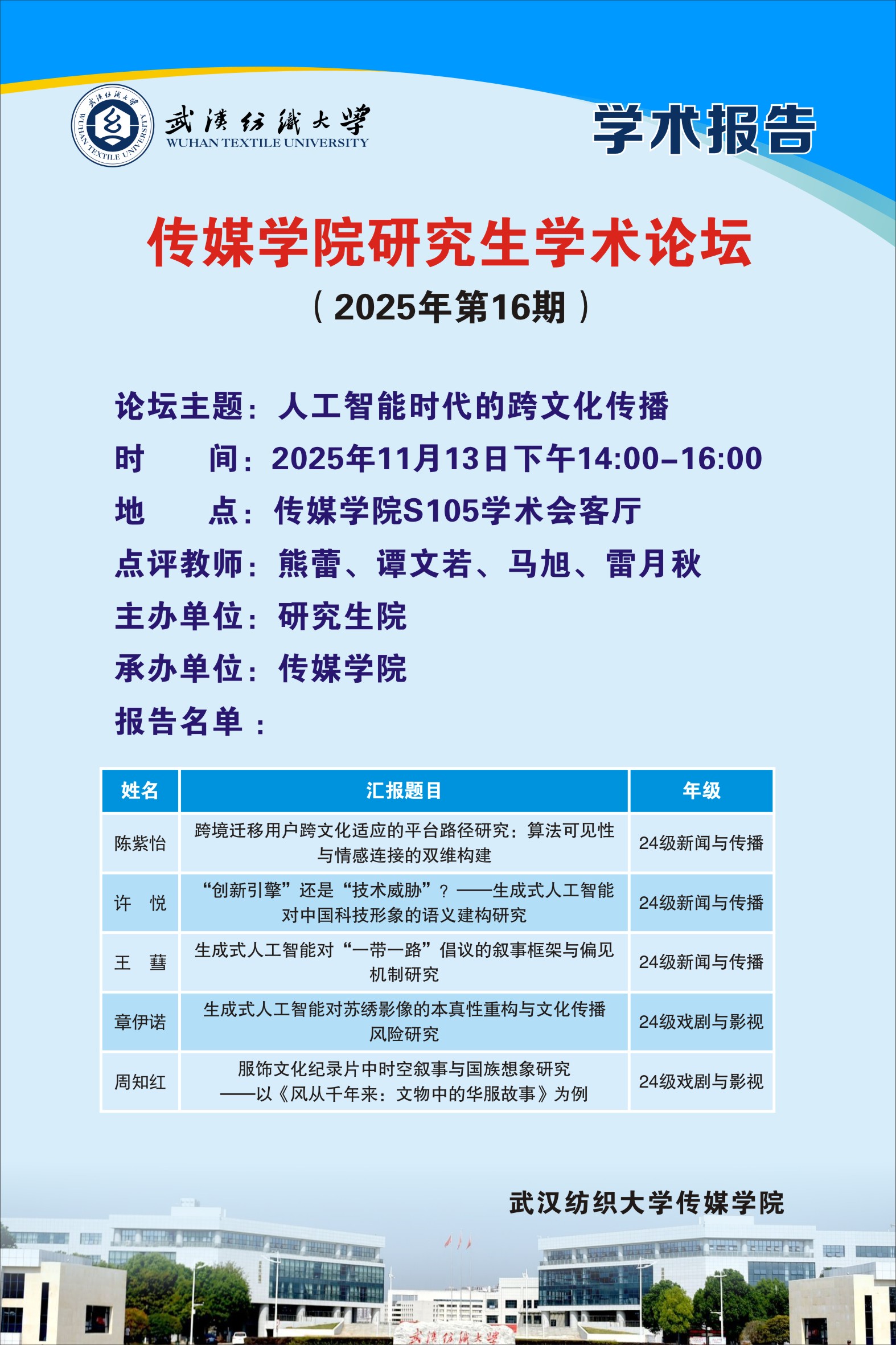 学术预告:第994期研究生学术论坛暨传媒学院2025年第16期研究生学术论坛
