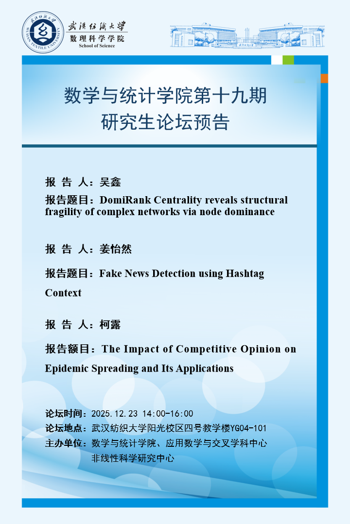 2025 12-23学术预告:第1062期研究生学术论坛暨数学与统计学院2025年第19期研究生…