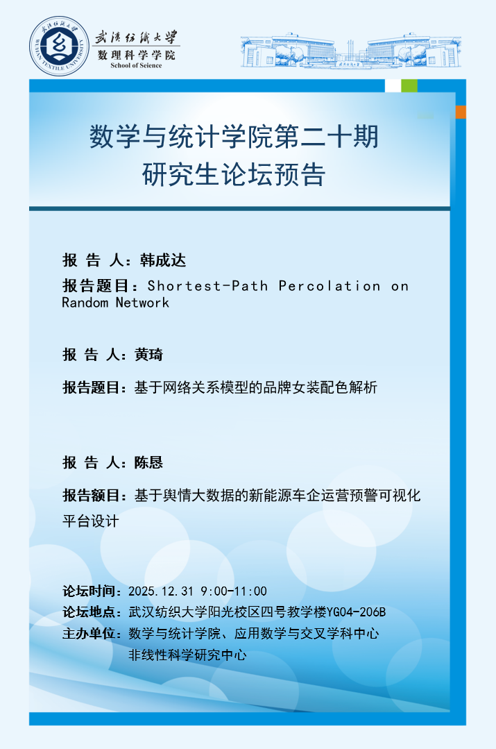学术预告:第1072期研究生学术论坛暨数学与统计学院2025年第20期研究生学术论坛