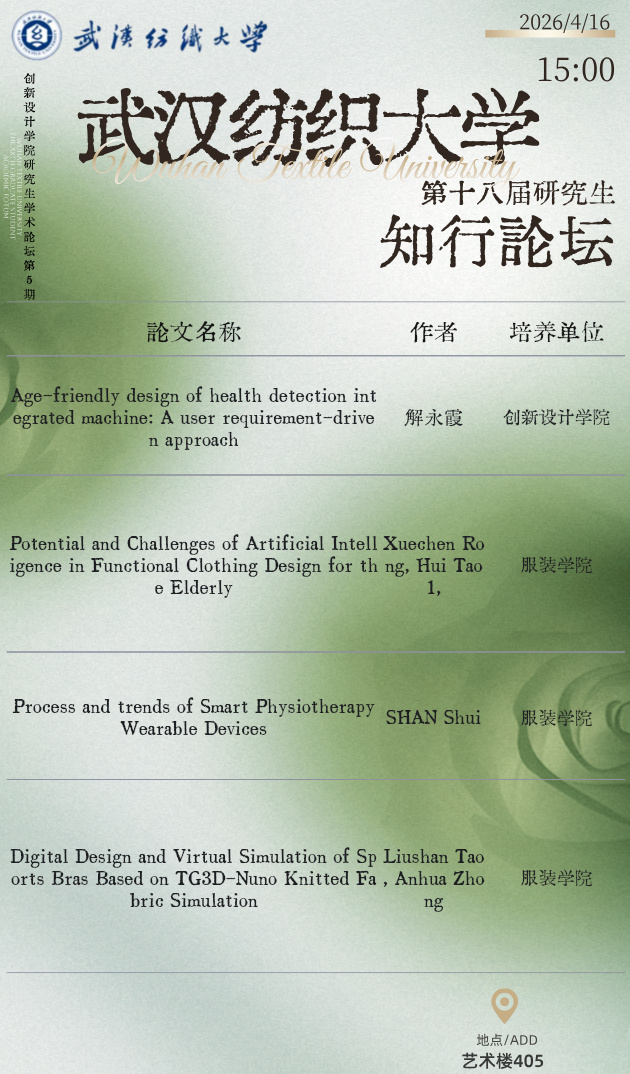 学术预告:武汉纺织大学第十八届研究生知行论坛博士二组分论坛——第1115期研究生学术论坛暨创新设计学院2026年第5期研究生学术论坛