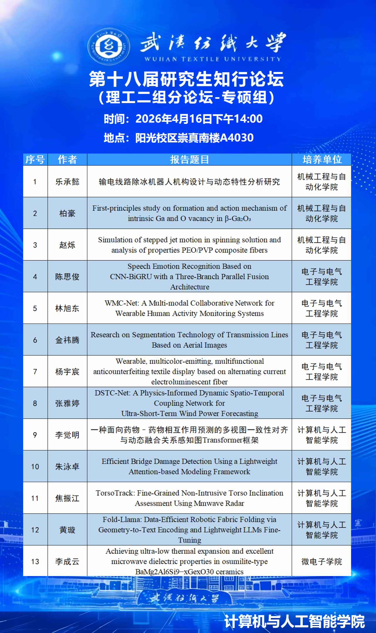 学术预告:武汉纺织大学第十八届研究生知行论坛理工二组分论坛——第1119期研究生学术论坛暨计算机与人工智能学院2026年第6期研究生学术论坛