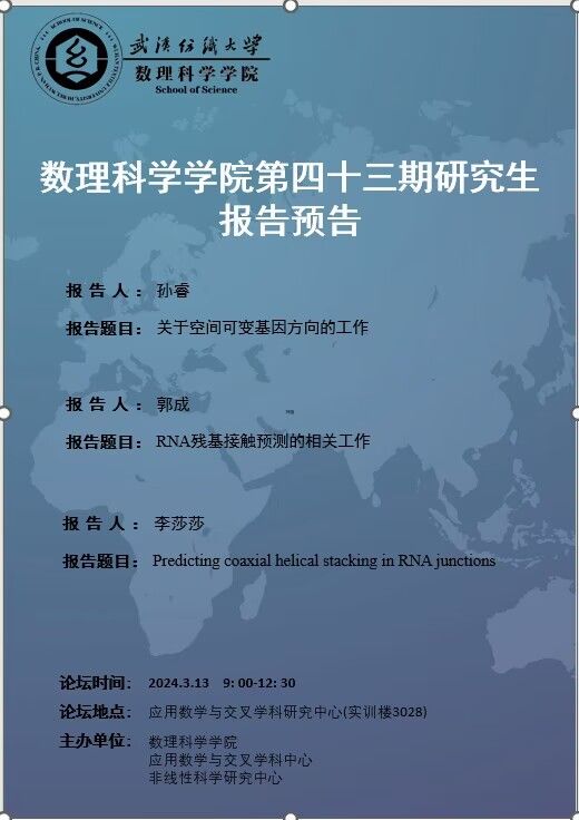 学术预告:第510期研究生学术论坛暨数理科学学院2024年第3期研究生学术论坛