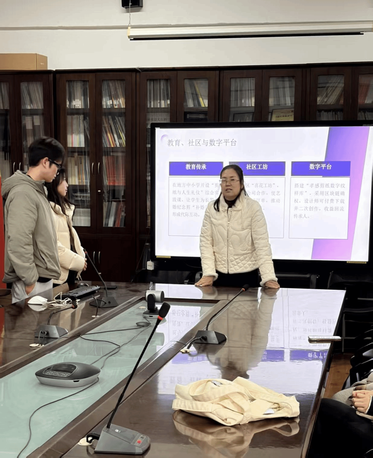 12月9日,武汉纺织大学创新设计学院2025年第16期研究生学术论坛在艺术楼二楼会议室顺利召开,此次论坛由伍云秀老师主持,7组研究生依次登台汇报,借助高清影像、动态图谱以及实物纹样等PPT的形式进行演示,内容主要围绕泥泥狗、蓝印花布、青铜纹饰、剪纸、侗锦、黄梅挑花等民间艺术为核心,从色彩哲学、符号转译、生活美学、活态传承、创新路径等维度展开深度剖析。