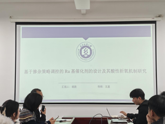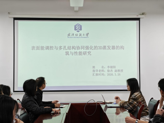 2026年3月26日,武汉纺织大学材料科学与工程学院在阳光校区成功举办了2026年第3期研究生学术论坛。本次论坛由吴静、柏自奎两位老师担任指导评委。学院硕士研究生李朝阳、周安鹏、胡胜、吴昊达四位同学围绕材料科学前沿领域,依次汇报了最新科研进展,集中展示了学院在太阳能水蒸发、纳米材料合成、催化材料设计及固态电池电解质等方向的前沿探索成果。
