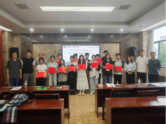 环工12302班何雨婷同学介绍了项目磷离尽致﹣多源固废基可除磷护坡单元的关键制备及运用;生物工程12302班胡顺同学介绍了项目码护舌安﹣3D打印三键超级拉曼码用于食品/药品溯源与防伪;纺织学院黄嘉琪同学介绍了项目智慧城市纱线基智能水泥复合材料;环境科学12201班刘芷怡介绍了项目铁基调理剂耦合微生物协同修复镉铬污染土壤的界面调控机制;应用化学12301班覃妹彤同学介绍了项目亚稳态催化剂突破尿素氧化能垒瓶颈赋能绿色转化;化妆品12202班陶冰珊同学介绍了项目智能突释一酸响应绿原酸双层微球的制备及应用;高分子12301班王润之同学介绍了项目"纤纸绝缘"﹣聚苯硫醚超细纤维复合芳纶绝缘纸;环工12302班吴家辉同学介绍了项目磁碳先锋:磁性多孔碳吸附﹣氧化﹣资源化三位一体驱动抗生素废水高效净化技术;化工12301班余梦云同学介绍了项目氢键调控多糖长余辉磷光用于湿度传感的研究;生物工程12301班张杰灵同学介绍了项目人雄激素源性脱发治疗;生物工程12302班张向楠介绍了项目生物质基席夫碱增强环氧树脂抑烟性能和机械性能;高分子12201班周成同学介绍了项目"雾遁卫士"-国内生物质类流体防雾剂开拓者;轻化12201班同学周燕霞介绍了项目如虎添翼﹣光热双隐身织物的设计与开发。各位同学汇报结束后,评委老师就项目内容与汇报的同学进行了交流,对各个项目进行了细致的点评指导。交流结束后,评委老师为参与汇报的同学颁发证书并合影留念。