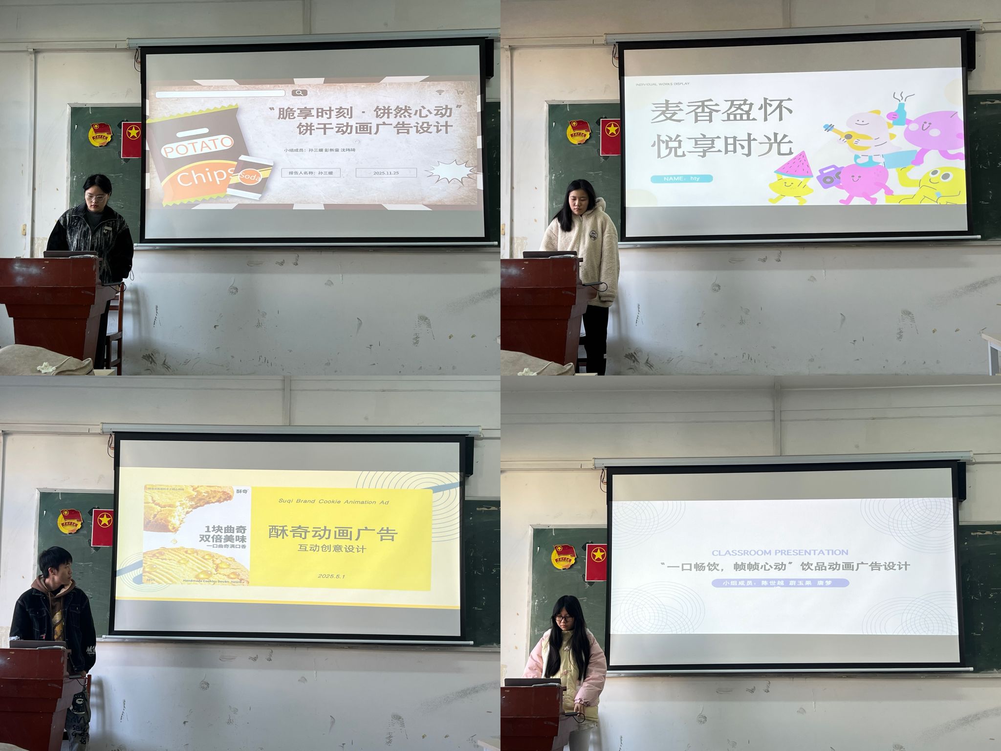 视传12201班的孙三媛同学汇报的主题是“脆享时刻·饼然心动”饼干动画广告设计。小组成员孙三媛、彭新童、沈玮琦以复古风格的画面设计,将饼干的酥脆质感与动画创意结合,通过搭配场景,生动展现饼干的美味时刻。创作者在画面构图和色彩运用上颇具巧思,既突出了饼干的产品特色,又以富有感染力的动画形式传递出“脆享”的愉悦感,展现出在食品类动画广告创意与视觉呈现上的专业能力,为饼干品牌推广提供了充满美味创意的设计方案。