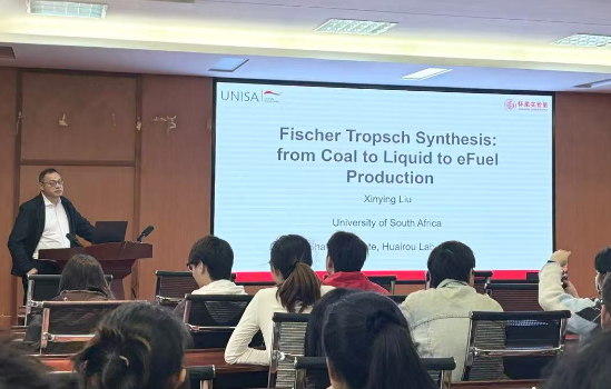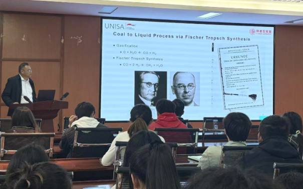 刘歆颖教授从南非的煤制液产业现状切入,提出了将氢能作为新能源载体的发展思路,并展望了南非未来的氢能发展路线图。同时,他介绍了自己负责的怀柔实验室煤合成油团队,该团队致力于煤炭高效低碳利用研究,旨在推动煤炭由燃料向原料转型,并开发高附加值化学品。报告结束后,刘歆颖教授与在场师生进行了互动交流,对大家提出的问题作了详尽解答现场学术氛围浓厚