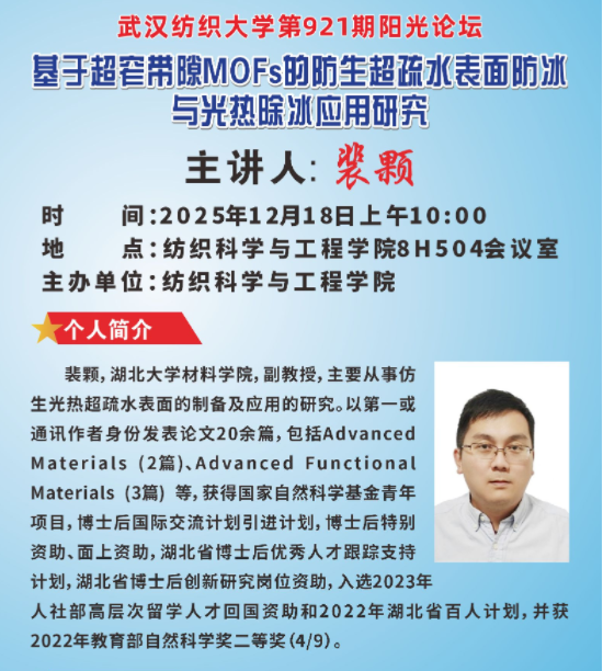 为进一步促进学院的科学研究水平,加强师生与学科间的学术交流,提升学院青年教师国家自然科学基金工作申报能力,纺织科学与工程学院邀请湖北大学裴颗副教授,于12月18日上午在8H504会议室以“基于超窄带隙MOFs的防生超疏水表面防冰与光热除冰应用研究”为题进行了学术交流。副院长姜会钰教授及学院青年教师参加了此次讲座,讲座由姜会钰主持。