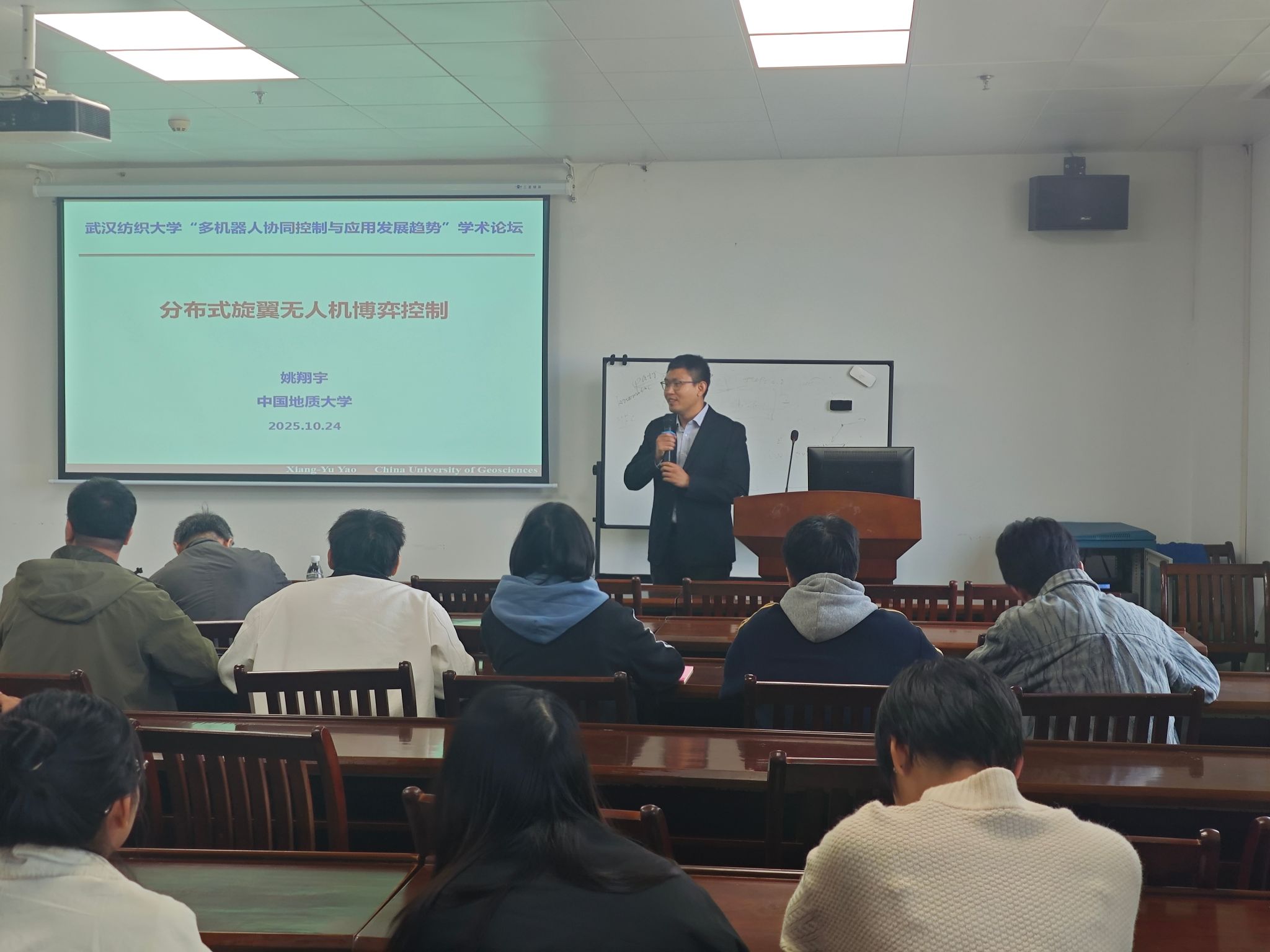 2025年10月24日下午,武汉纺织大学机械工程与自动化学院在10号教学楼408会议室成功举办第96期“阳光论坛”学术沙龙。本期沙龙以“多机器人协同控制与应用发展趋势”为主题,邀请多位在智能控制与机器人系统领域具有深厚学术造诣的专家学者作专题报告,吸引了学院师生及相关科研人员积极参与,现场学术氛围浓厚、交流热烈。