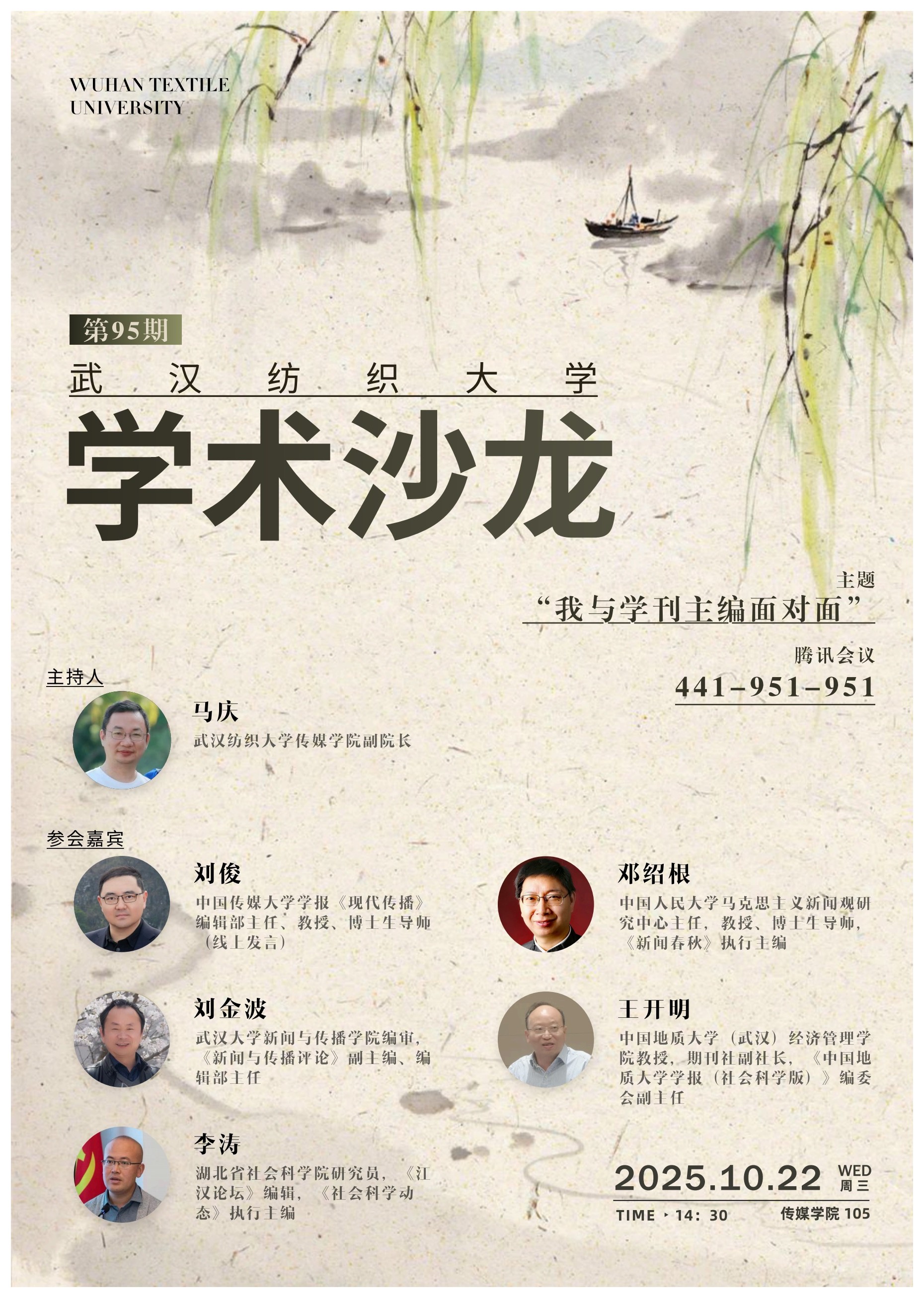 2025年10月22日,五家CSSCI学刊主编、编辑齐聚亮相武汉纺织大学第95期学术沙龙之“我与学刊主编面对面”。来自《现代传播》《新闻春秋》《新闻与传播评论》《中国地质大学学报》《江汉论坛》等五家知名学刊的编审专家围绕青年学者普遍关心的中文核心期刊“发表难”“周期长”“刊文少”等问题与纺大师生展开线上线下的深入交流。武汉纺织大学传媒学院、服装学院、艺术学院、外国语学院师生,武汉大学博士研究生、校友李一涵参会,沙龙由武汉纺织大学传媒学院副院长马庆主持。