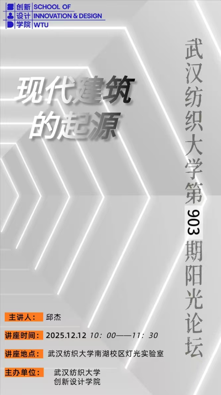 2025年12月12日上午10:00,武汉纺织大学创新设计学院于南湖校区灯光实验室举办第903期阳光论坛。本次论坛特邀建筑设计领域专家邱杰老师担任主讲嘉宾,以“现代建筑的起源”为主题展开深度分享,旨在帮助设计专业师生厘清现代建筑的发展脉络,理解其核心设计理念与变革逻辑,为当代设计实践提供理论支撑。创新设计学院师生代表参加了此次论坛。